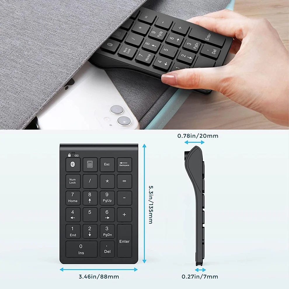 • 【SLEEK, PORTABLE & ERGONOMIC DESIGN】 Our bluetooth 10-Key number pad is only 93g/0.2lb, 5.2*3.46*0.27inch; Lightweight and Portable. Easily put this ultra slim bluetooth keypad into your laptop bag, backpack, suitcase, or pockets without taking up space. Integrated Ergonomic tilt provides a comfortable smooth typing experience and reduces strain. The compact wireless numeric keypad is great for home, office, traveling, business trip, and more.