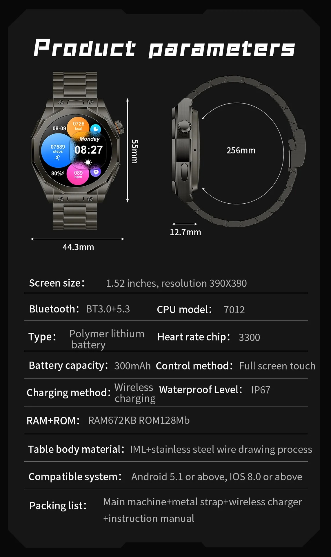 Função : Passômetro, rastreador de condicionamento físico, rastreador de sono, lembrete de mensagem, lembrete de chamada, atender chamada, discar chamada